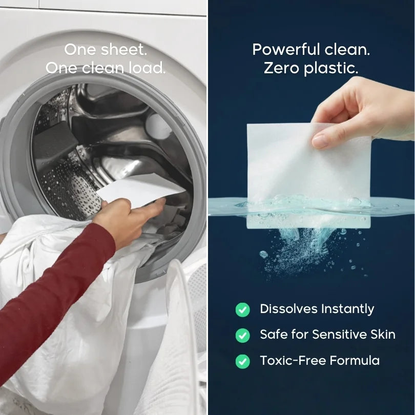Our ultra-compact sheets free up your shelves and your conscience. 95% less space. 100% compostable. Zero plastic guilt.